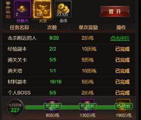 爵位可通过晋升以及提升官位来拥有奖励和增益。爵位晋升需要获取“历练值”,可通过完成每日任务获得,请积极完成日常吧,当历练点积攒到一定程度就可获得晋升机会,晋升可提升多种属性的同时,还可以获得元宝,金币和经脉丹等材料奖励。