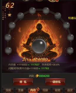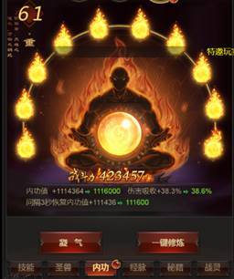 内功系统分为“修炼”和“凝气”培养两种方式。先说“修炼”,主要通过消耗金币来提升内功等级,内功等级越高,内功值、内功恢复速度和吸收伤害的比例也会相应提高,当角色受到伤害时,就可以消耗内功值来抵消一部分的伤害,可谓保命神功了。